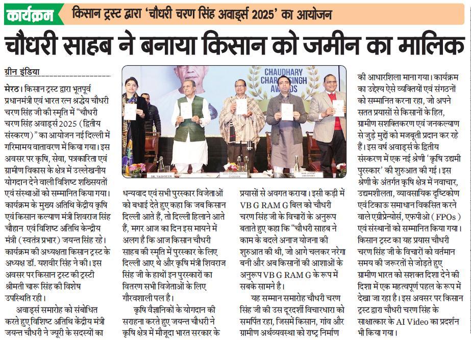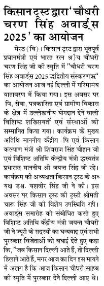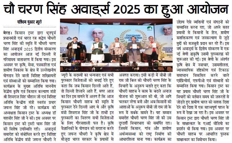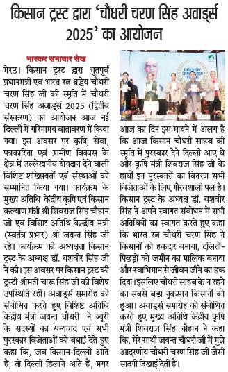 किसान ट्रस्ट द्वारा भूतपूर्व प्रधानमंत्री एवं भारत रत्न श्रद्धेय चौधरी चरण सिंह की स्मृति में "चौधरी चरण सिंह अवार्ड्स 2025" का दूसरा संस्करण आयोजित किया गया। कार्यक्रम के मुख्य अतिथि केंद्रीय कृषि एवं किसान कल्याण मंत्री शिवराज सिंह चौहान एवं विशिष्ट अतिथि केंद्रीय मंत्री जयंत चौधरी रहे।