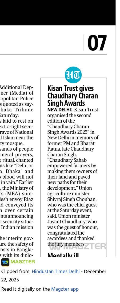 Kisan Trust organised the second edition of the "Chaudhary Charan Singh Awards 2025" in New Delhi in memory of former PM and Bharat Ratna, late Chaudhary Charan Singh. Union agriculture minister Shivraj Singh Chouhan was the chief guest at the Saturday event.